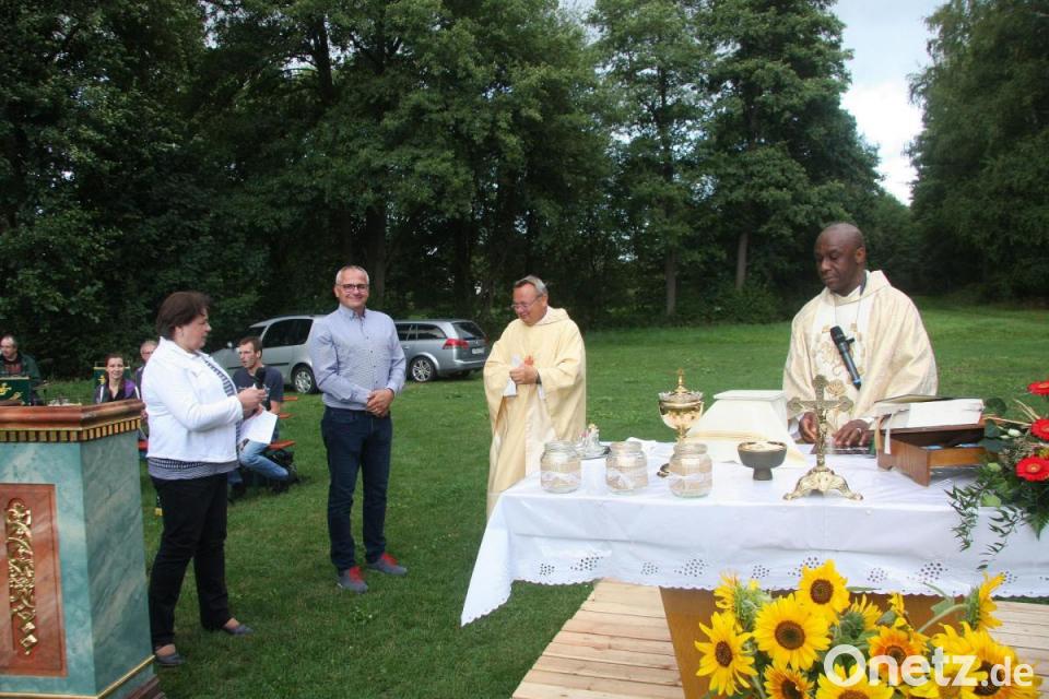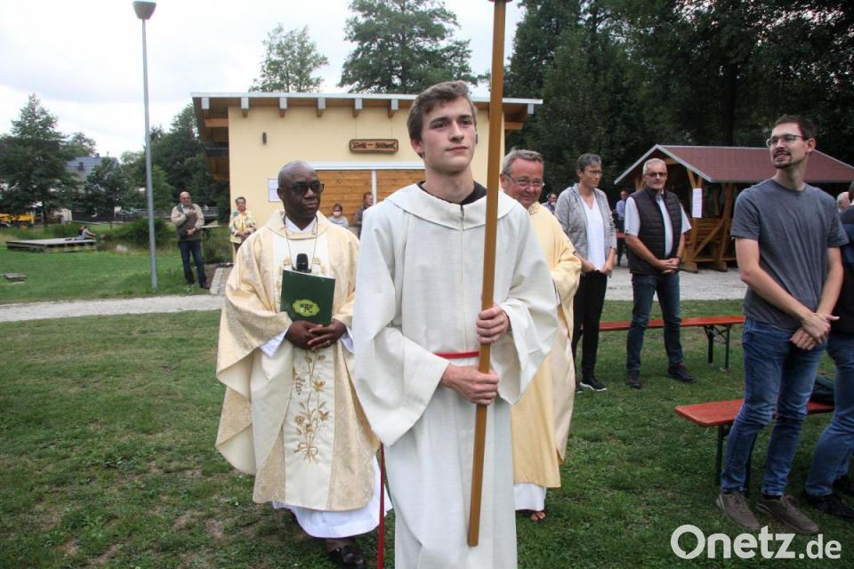 Die „Grüne Mitte“ Pullenreuths war zu einem Andachts- und Fest-Ort geworden. Mit einem überaus herzlichen „Ich wünsche Euch einen wunderschönen Abend, wie geht es Euch?“, hieß Dr. Chinedu Paul Ezenwa die Gläubigen, darunter auch viele Neusorger und aus anderen Steinwald-Orten, auf der Dorfwiese willkommen. Begleitet wurde Pfarrer Paul von einem Kreuz tragenden Ministranten und Pfarrer Josef Waleszczuk. Platz genommen hatten auch die Steinwaldmusikanten unter der Leitung von Johannes Hecht, um die Feierstunde mit der Schubert-Messe und anderen Liedern zu umrahmen. Ungewöhnlich für einen Gottesdienst war die 3-Sprachigkeit, die viele überraschte. In den Mittelpunkt der Gabenbereitung und der Wandlung rückte auch eine der vielen Nigerianischen Landessprachen: Igbo. Das Vater Unser wurde lateinisch, der überwiegende Teil der Messe aber in Deutsch gesprochen.