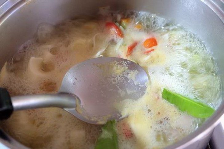 5. ลดไฟลงให้น้ำเดือดเพียงเล็กน้อย จากนั้นก็ปรุงรสด้วยน้ำปลา
