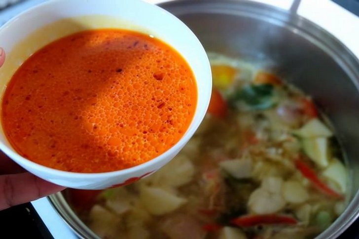 4. ต่อไปก็ผสมน้ำพริกเผากับนมเข้าด้วยกัน แล้วเทลงไปในหม้อเลย