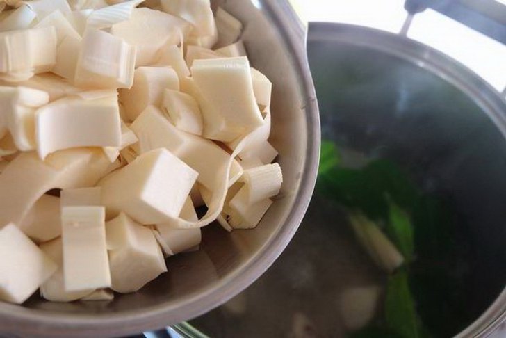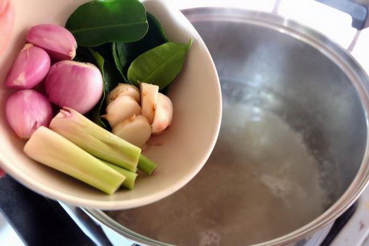 1. ก่อนอื่นก็นำน้ำสะอาดเทใส่หม้อประมาณ 1/3 ของหม้อ ใส่ซุปก้อนลงไปแล้วรอจนกว่าจะเดือด จากนั้นก็ใส่หอมแดง ข่า ตะไคร้ ใบมะกรูดลงไป