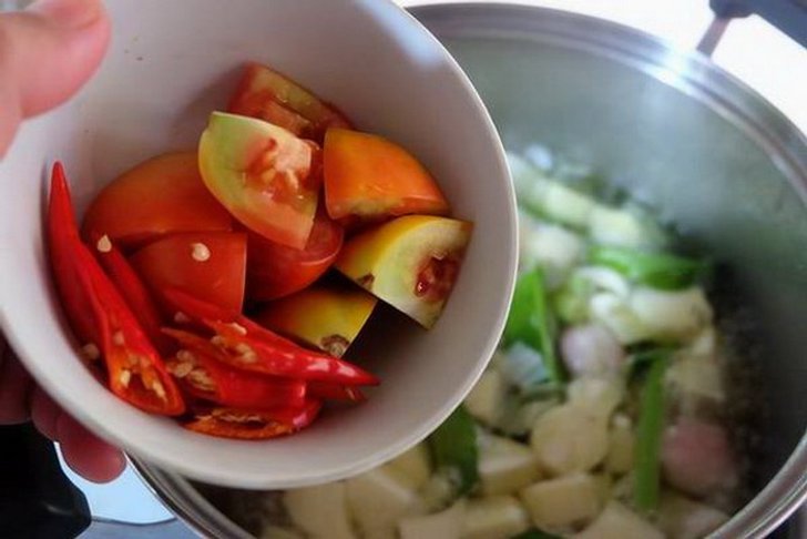 2. รอจนเดือดแล้วก็ใส่พริกขี้หนูทุบกับมะเขือเทศหั่นเป็นชิ้นพอดีคำลงไป