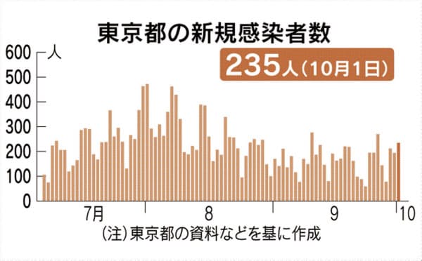 同日開かれた都の「モニタリング会議」の分析によると、9月30日時点で直近1週間の1日当たりの新規感染者数は平均183.6人で、前週の145.1人から増加した。前週は4連休があり検査数が少なかった影響もあるとみられるが、出席した専門家は「感染者数は高水準で推移しており、増加傾向が続くことに厳重な警戒が必要だ」と話した。