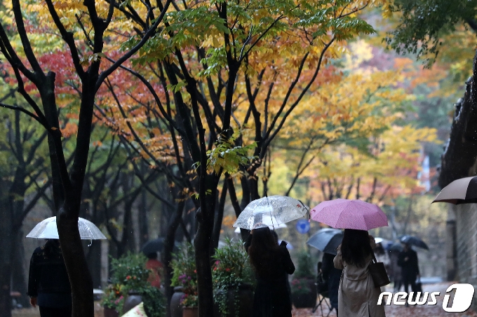 | 가을비가 내리는 지난 1일 오후 서울 중구 덕수궁 인근에서 시민들이 우산을 쓰고 발걸음을 옮기고 있다. 2020.11.1/뉴스1 © News1 이승배 기자 |