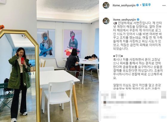 서현진은 18일 자신의 SNS에 "내 인터넷 계정이 해킹을 당했다"고 알렸다. 이어 서현진은 "얼마 전부터 해외에서 꾸준히 내 아이디로 로그인 시도가 있어서 나름 비번도 여러 번 바꾸고 조치를 했는데, 며칠 전 내 가족들에게 나를 사칭하고 피싱 시도가 있었고, 적잖은 금전적 피해로 이어졌다"고 털어놨다.