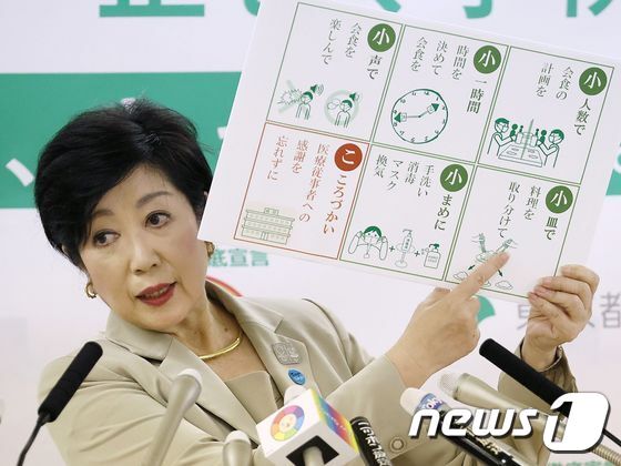 | 고이케 유리코 일본 도쿄도 지사가 도쿄 도청사에서 코로나19 예방 수칙이 담긴 알림판을 들고 기자회견을 하고 있다. © AFP=뉴스1 |