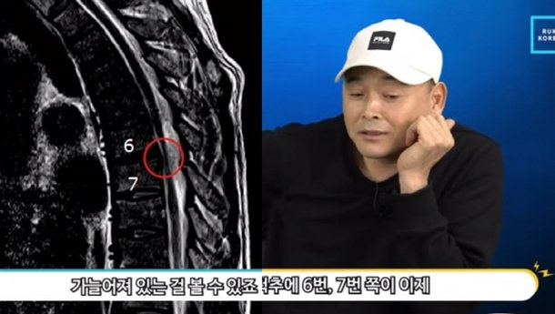 영상에는 이봉주의 흉추 사진이 공개됐다. 진행자는 "6번 하고 7번 사이 신경조직이 가늘어져 있는 것을 볼 수 있다"며 "신경을 압박하면서 문제가 된 것으로 보인다"고 설명했다.