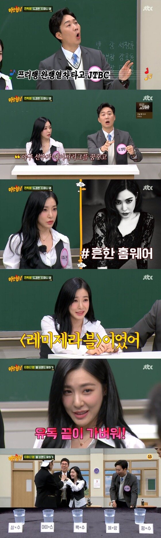 티파니 영은 물맛으로 생수 브랜드를 구별할 수 있다고 말해 놀라움을 자아냈다. 이를 증명해보기로 했다. 티파니 영은 다섯 가지 생수를 신중하게 마셨다. 아무도 못 맞힐 거라고 생각했지만, 에OO와 아이O스, 백O수까지 맞혔다. 그뿐만 아니라 생수별로 맛의 특징까지 설명해 눈길을 끌었다. 마지막 남은 두 가지까지 맞힌 티파니 영은 본인도 놀란 듯 눈을 커다랗게 떴다.