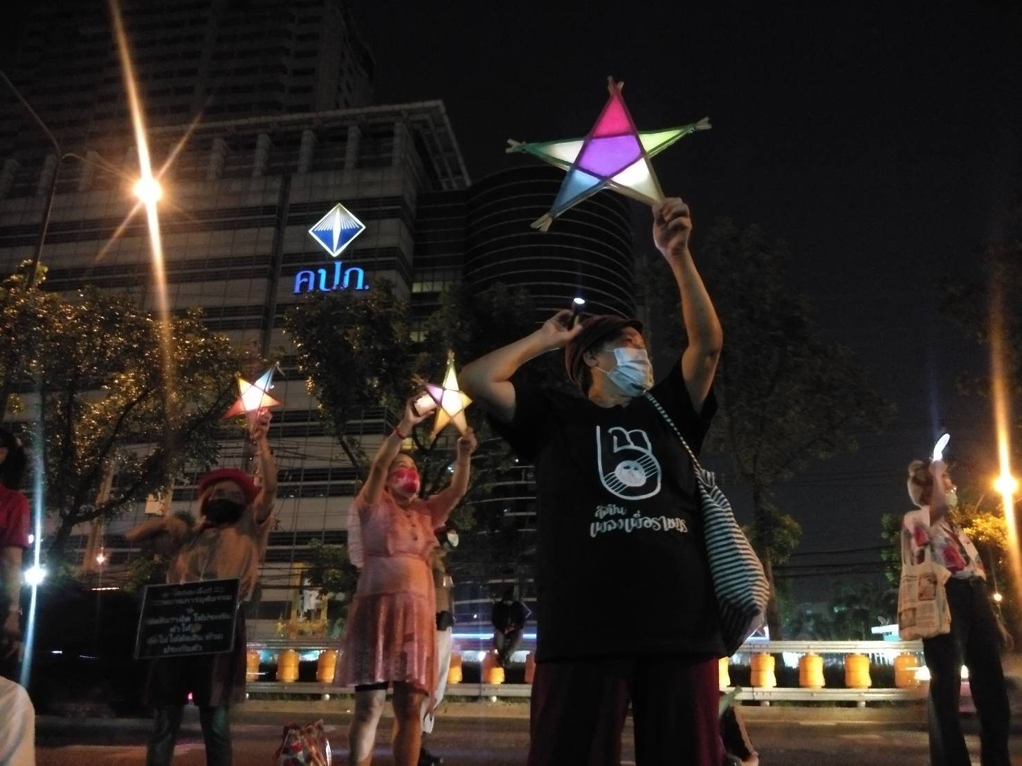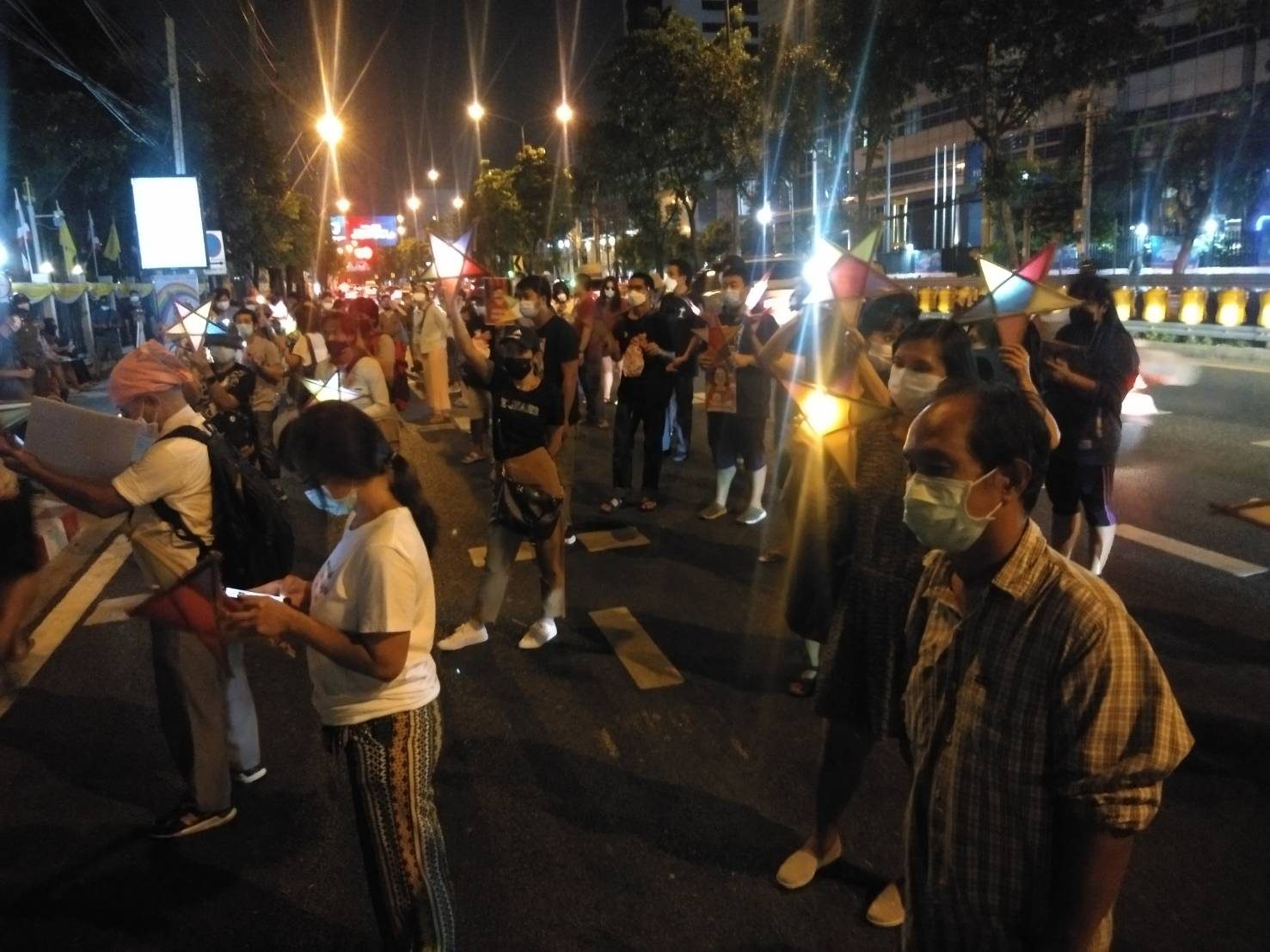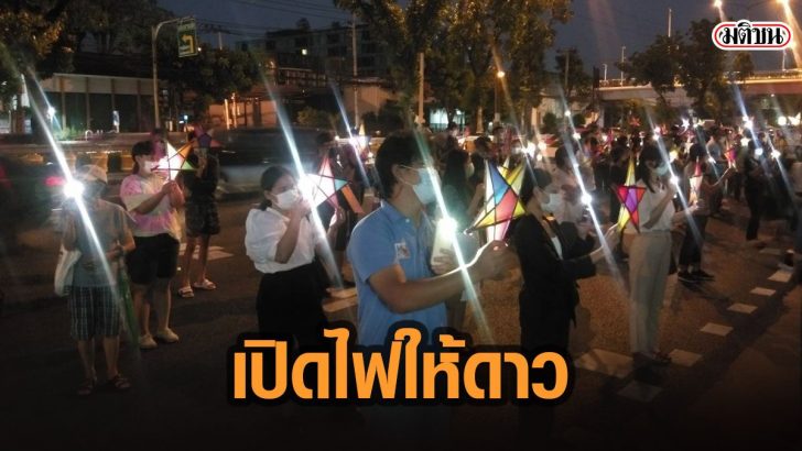 บรรยากาศเมื่อเวลาประมาณ 19.00 น. ประขาชนยืนส่องไฟจากโทรศัพท์มือถือหรือไฟฉายที่เตรียมมาไปยังดาวกระดาษ สร้างความสว่างไสวบริเวณหน้าประตูศาล