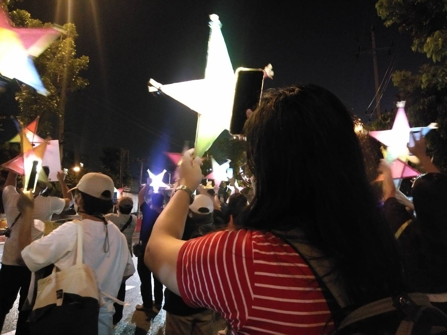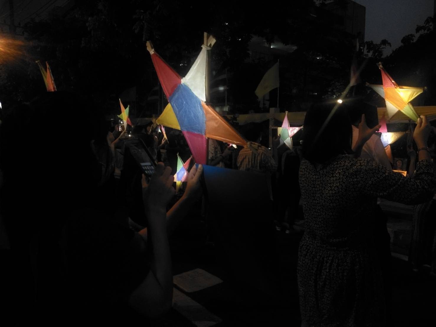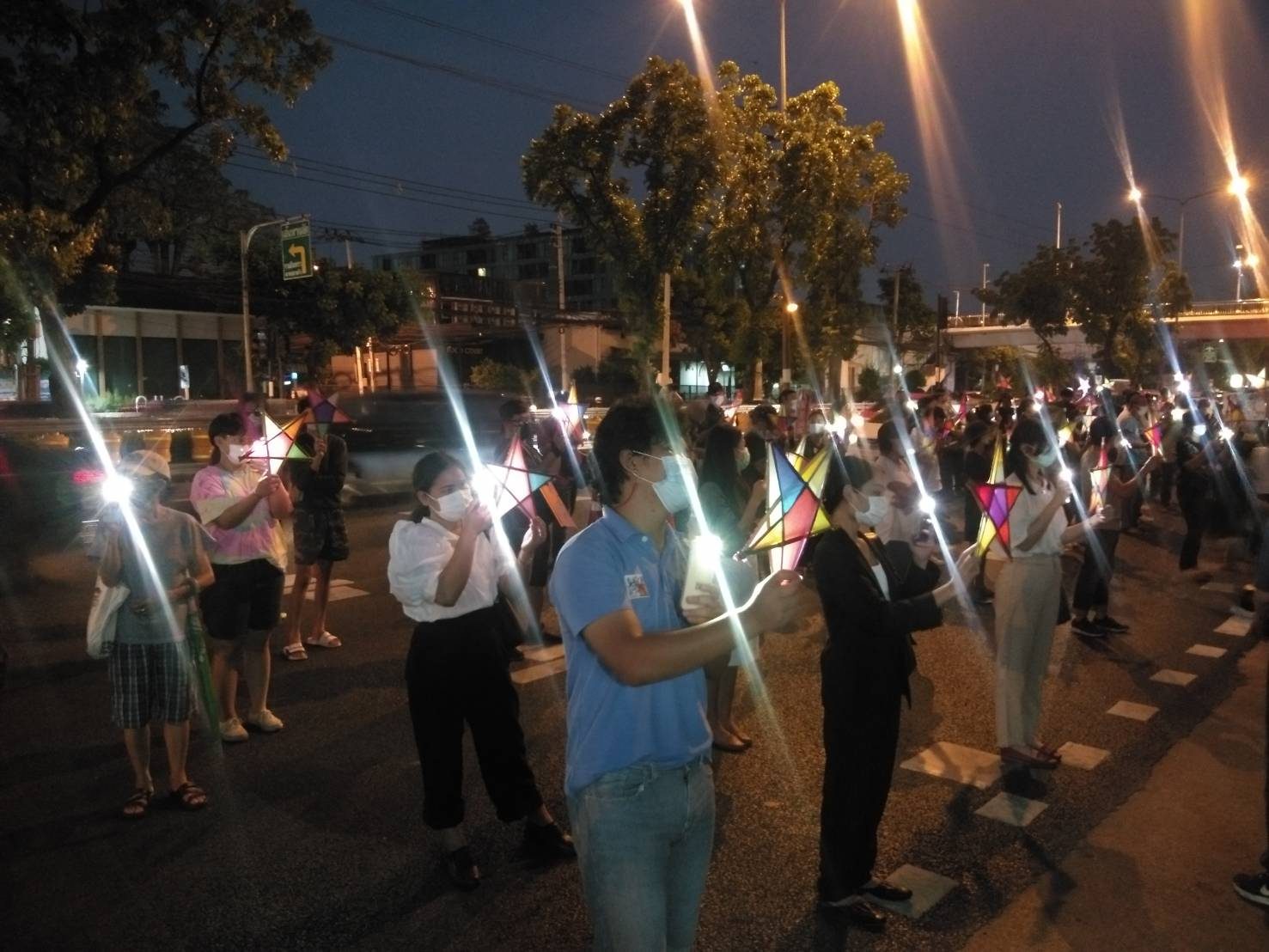 บรรยากาศเมื่อเวลาประมาณ 19.00 น. ประขาชนยืนส่องไฟจากโทรศัพท์มือถือหรือไฟฉายที่เตรียมมาไปยังดาวกระดาษ สร้างความสว่างไสวบริเวณหน้าประตูศาล