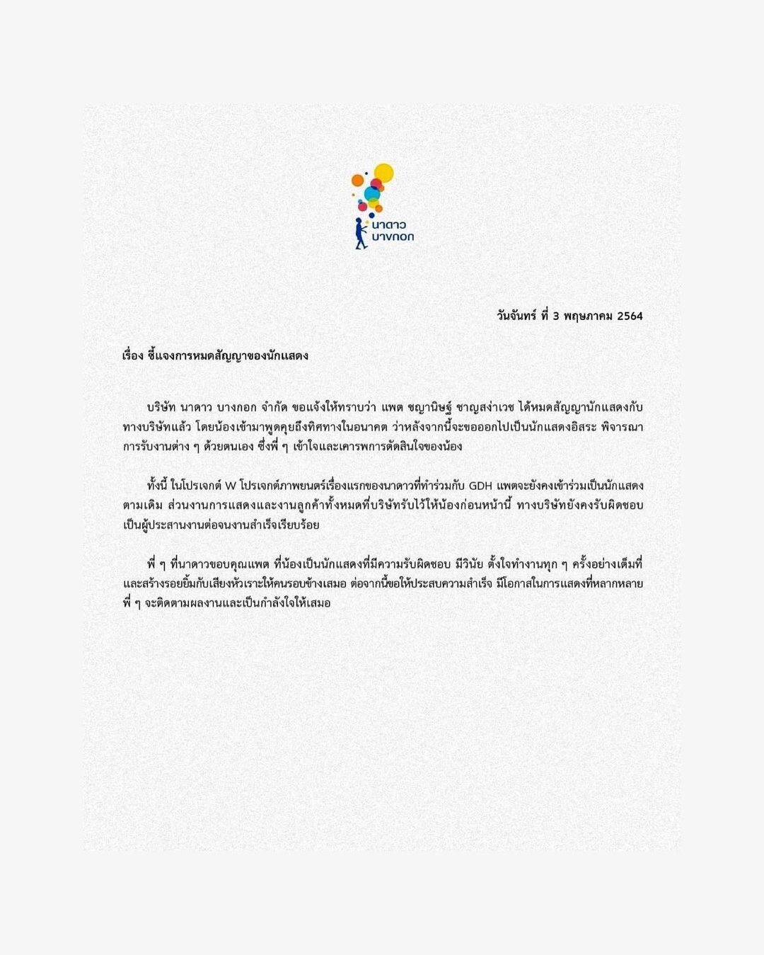 ถึงขนาดที่นักแสดงสาว แพต ชญานิษฐ์ ชาญสง่าเวช ออกมาบอกว่ารู้สึกใจหาย เมื่อทางต้นสังกัด นาดาวบางกอก ได้ออกจดหมายประกาศว่านักแสดงสาวได้หมดสัญญากับทางค่ายแล้ว
