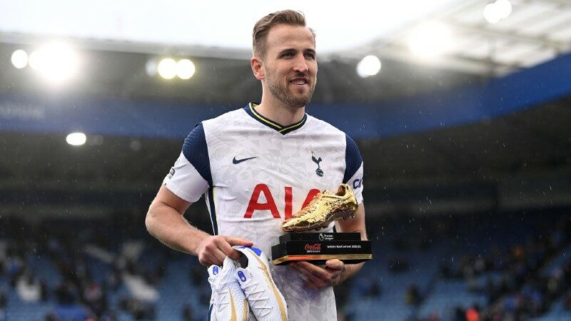 Harry Kane of Tottenham Hotspur poses with the Coca-Cola Zero Sugar Golden Boot Winner award following his team’s victory in the Premier League match between Leicester City and Tottenham Hotspur. (Photo by Laurence Griffiths/Getty Images)