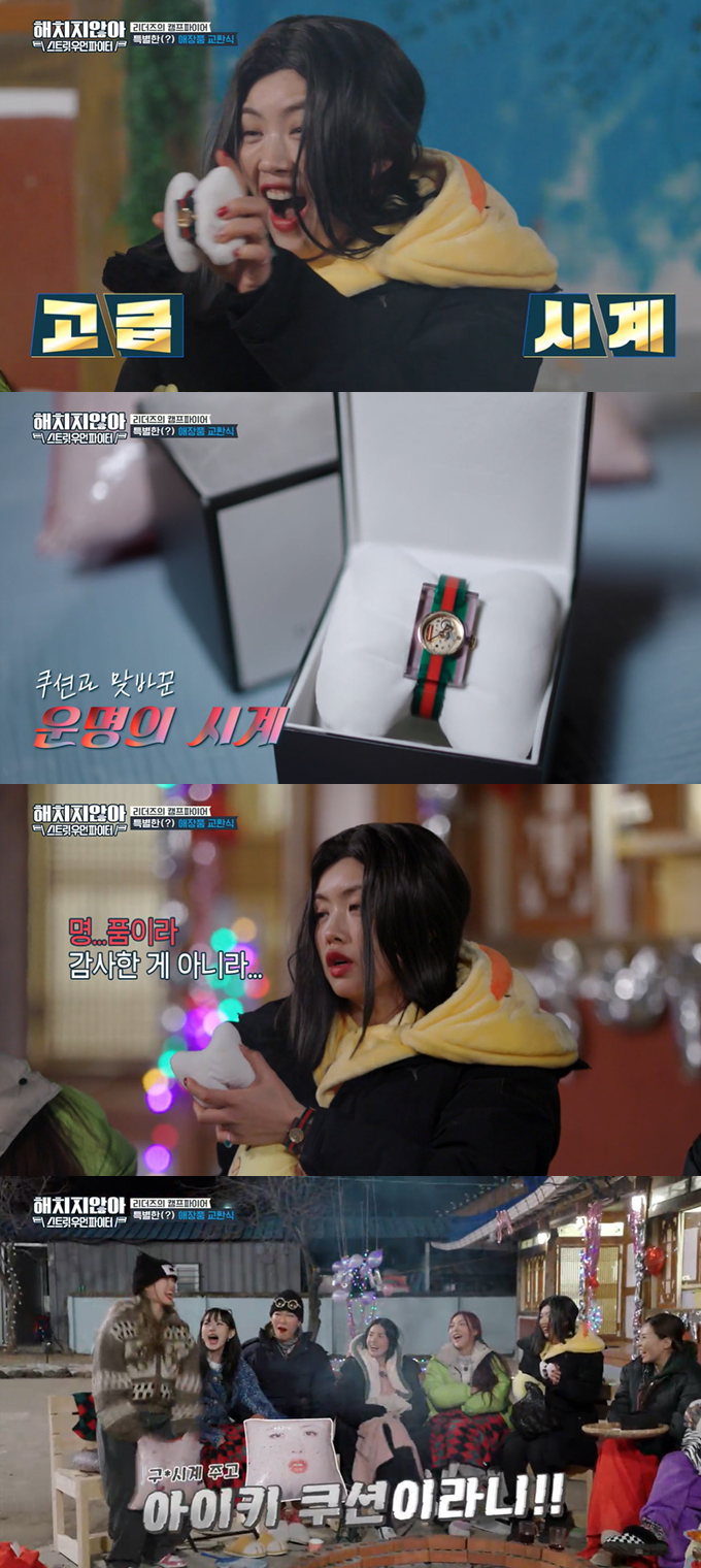 리정은 아이키 얼굴 쿠션을 이리저리 휘두르며 "내가 이거 받으려고 저거 가져왔냐"고 농담을 하고는 "꼭 잘 껴달라. 언니한테 잘 어울릴 것 같다고 하지 않았냐"고 말했다.