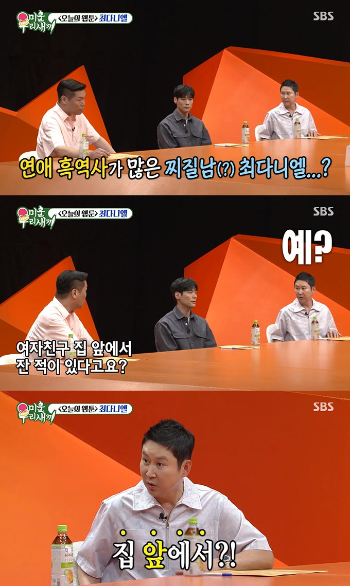 이날 방송에서 MC 서장훈은 "'로코 장인' 최다니엘은 실제로는 너무 찌질한 나머지 연애 흑역사가 굉장히 많다고 한다. 여자친구 집 앞에서 잔 적이 있냐"고 물었다.