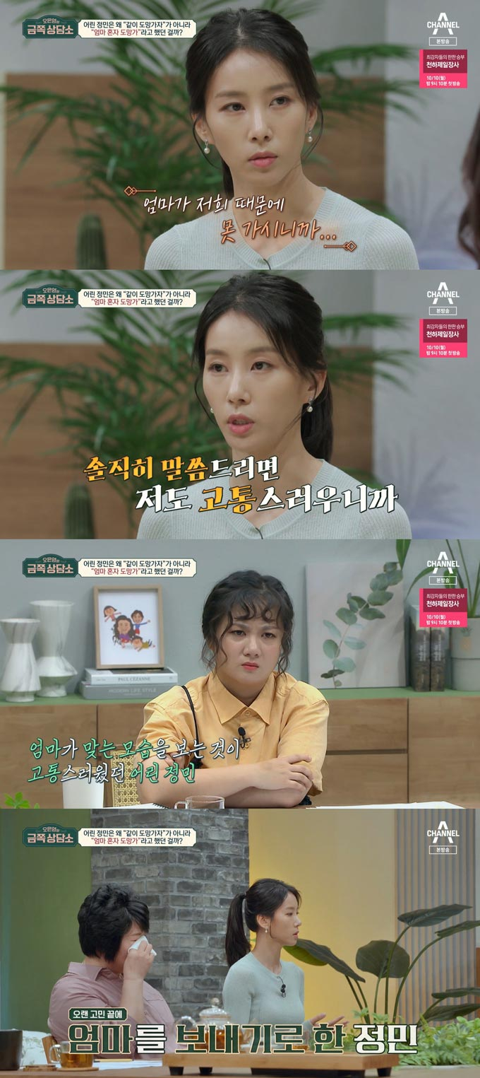 김정민은 "결국 (내가) 엄마와 똑같은 입장이 된 거다. 거기서는 미래가 없었다. 나를 학교도 안 보내고 있었으니까"라며 "'누나가 데리러 올게'라고 했지만 예측이 됐다. 내가 있을 때는 내가 (아빠의 폭력을) 막아줄 수 있지만, 내가 없으면 어떻게 될 지 알지만 당시에는 답이 없었다. 다 주저앉을 수는 없지 않냐"며 눈물을 흘렸다.