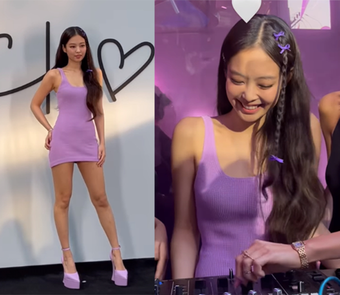 이날 제니는 몸매가 고스란히 드러나는 보라색 미니 원피스를 착용했다. 그는 매끈한 어깨와 잘록한 허리로 보는 이들의 감탄을 자아냈다. 여기에 제니는 원피스와 같은 색의 킬힐을 신고 한쪽 팔목에 뱅글을 매치했다.