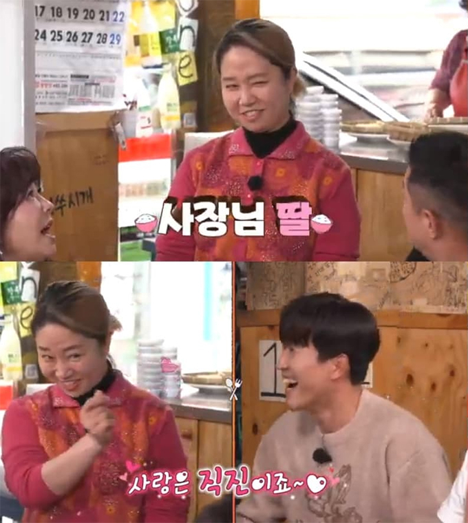 이에 박명수는 장난기가 발동해 김종민을 가리키며 "(우리 종민이) 평상시에 어떻게 생각하셨냐"며 핑크빛 기류를 형성했다. 이에 전집 사장 딸은 "좋다. 코요태 시절부터 팬이었다"고 답했다. 그는 김종민을 향해 수줍게 손가락 하트를 만들어 보이며 '직진' 대시를 해 웃음을 자아냈다.