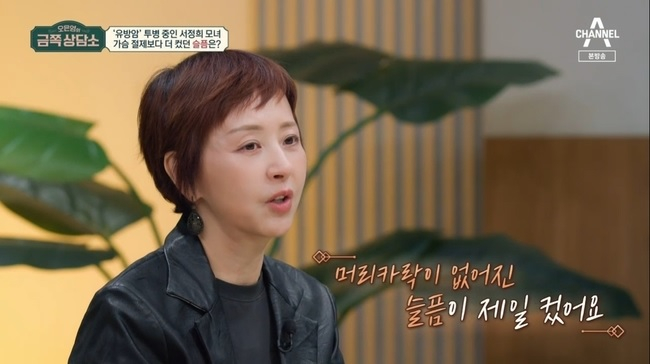 서정희는 "사실 암 때문에 가슴을 절제했을 때보다 더 슬펐던 것은 머리카락이 없어졌을 때"라며 "머리카락이 한 올도 없어 삭발 머리가 된 내 모습을 보는 데 마음이 많이 무너졌다"고 토로했다.