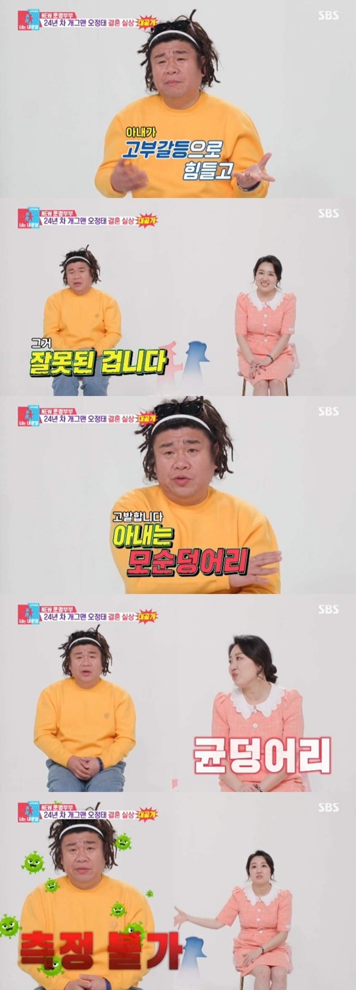 이에 아내 백아영은 "남편은 균덩어리다"라며 집안 세균 측정 결과 변기 수치가 0인 반면, 남편 오정태의 손은 측정 불가가 떴다고 고백해 모두를 놀라게 했다.